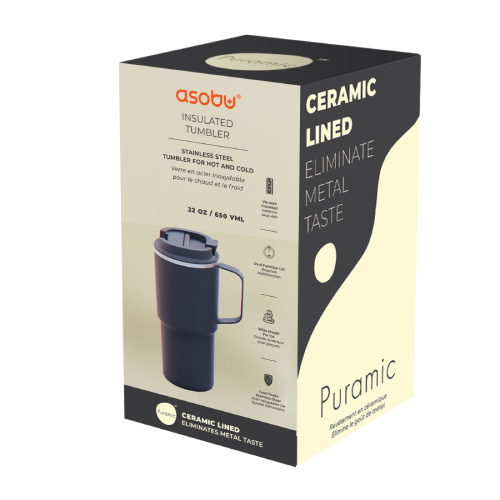 Meet our Nitro Tumbler – an extra-large spill-proof coffee mug with the Asobu Puramic™ Finish! Enjoy a 100% spill-proof experience with the familiar store-bought coffee sip lid. The No Metal Taste ceramic lining ensures pure flavor on the go. Double-walled, vacuum-insulated stainless steel construction keeps your coffee hot for hours, and as an added bonus it is 22oz and fits standard cupholders. With an easy-to-carry handle, it's the perfect Travel Mug for your daily adventures!